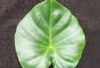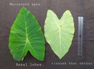 Leaves are up to 40 cm x 24.8 cm and sprout from the rhizome. They are dark green above and light green beneath. They are triangular-ovate, sub-rounded and mucronate at the apex, with the tip of the basal lobes rounded or sub-rounded. The petiole is 0.8 – 1.2 m high (ಕೃಪೆ: ವಿಕಿಪೀಡಿಯ)